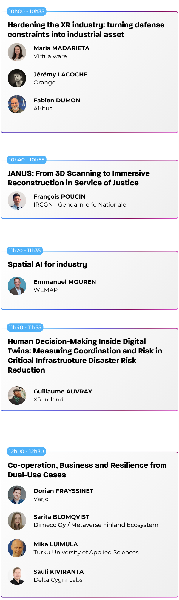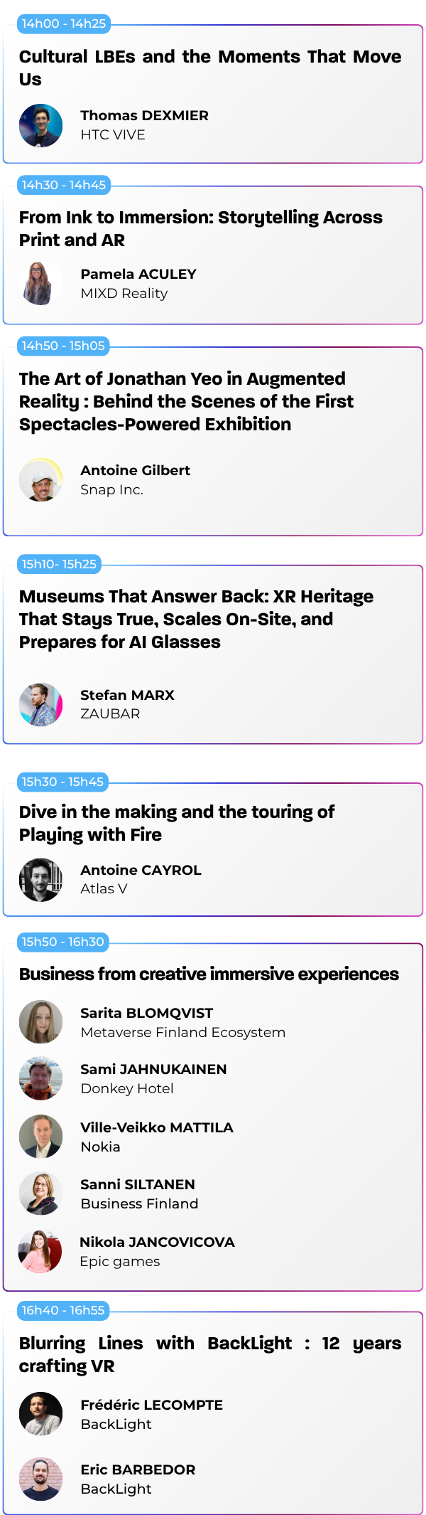 Nos conférences sont ouvertes à tous les visiteurs muni d’un « Full Pass » ou d’un Pass avec l’option « Sessions », qu’il s’agisse de professionnels du secteur, de novices curieux ou d’experts en technologie immersive. Les sessions sont conçues pour offrir des insights à différents niveaux de compétence.