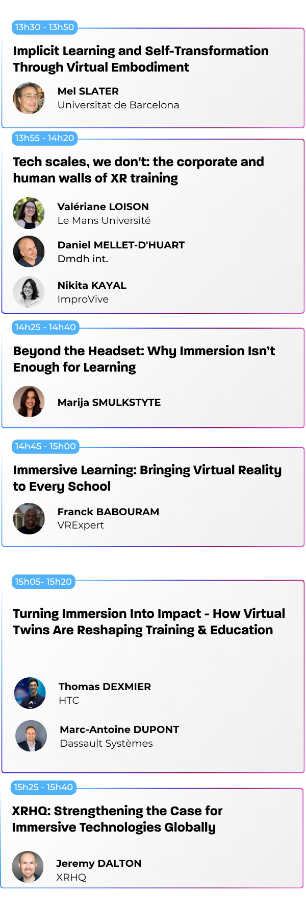 Nos conférences sont ouvertes à tous les visiteurs muni d’un « Full Pass » ou d’un Pass avec l’option « Sessions », qu’il s’agisse de professionnels du secteur, de novices curieux ou d’experts en technologie immersive. Les sessions sont conçues pour offrir des insights à différents niveaux de compétence.