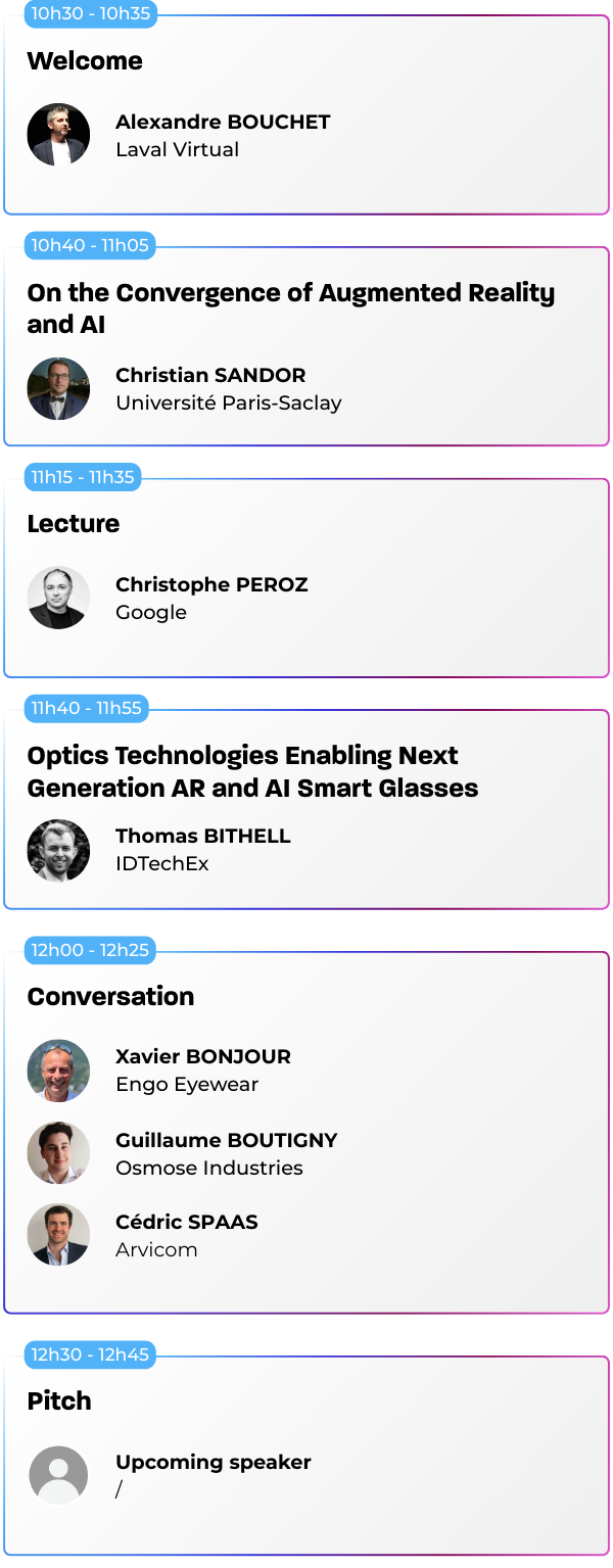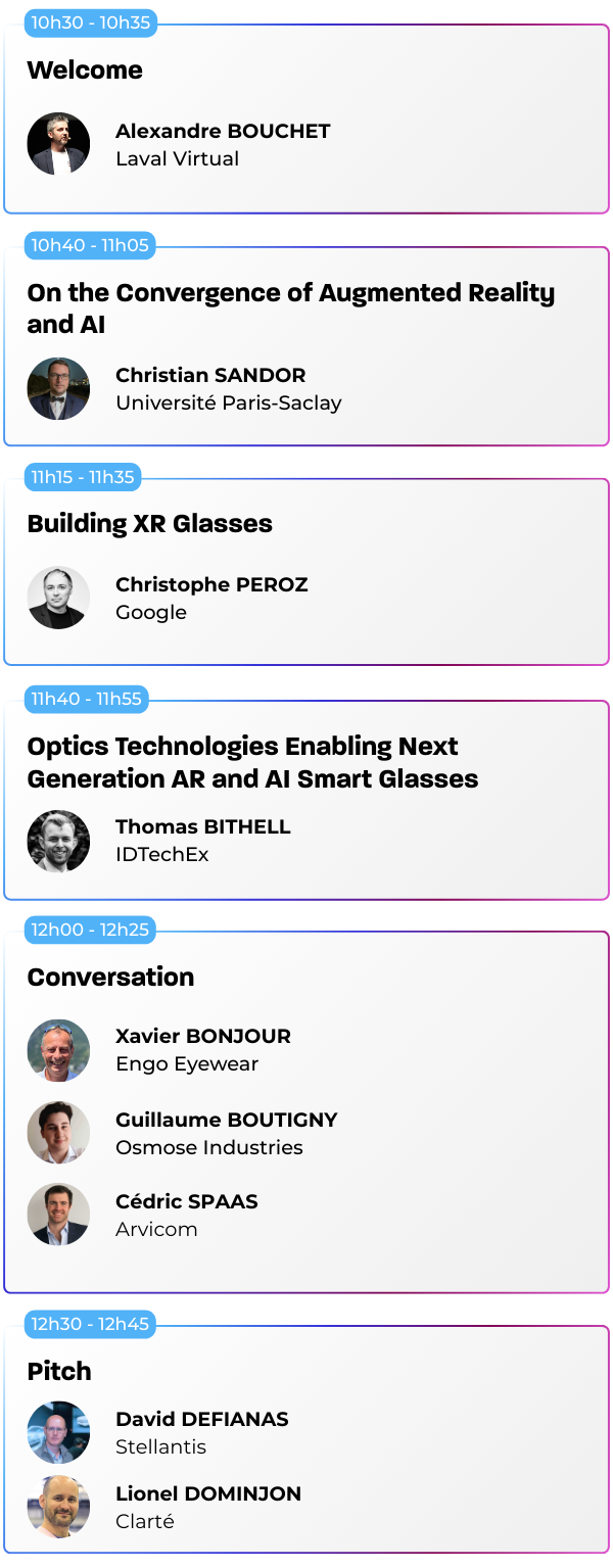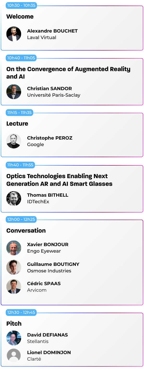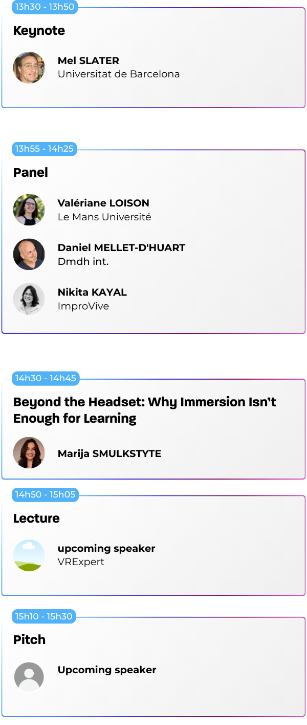 Nos conférences sont ouvertes à tous les visiteurs muni d’un « Full Pass » ou d’un Pass avec l’option « Sessions », qu’il s’agisse de professionnels du secteur, de novices curieux ou d’experts en technologie immersive. Les sessions sont conçues pour offrir des insights à différents niveaux de compétence.