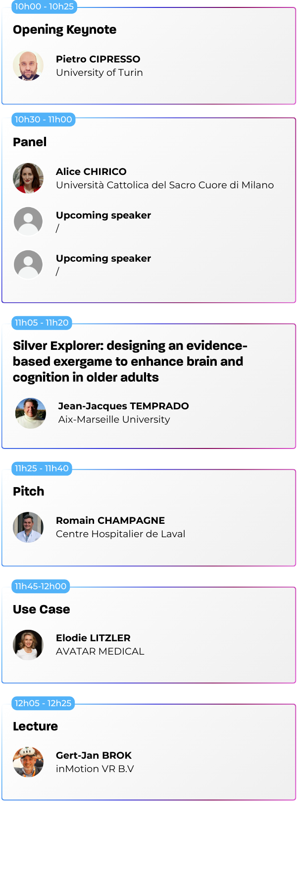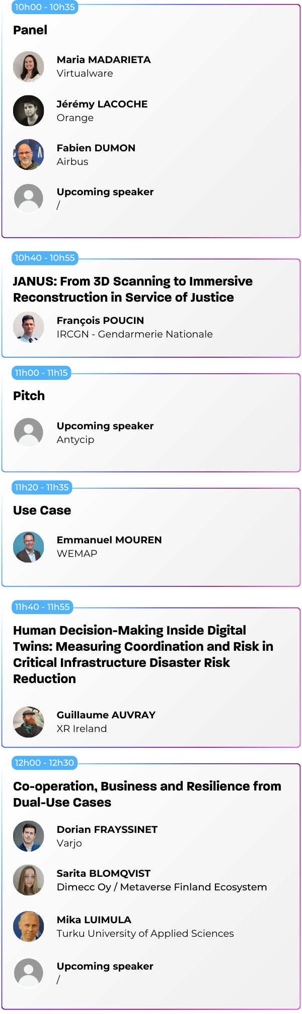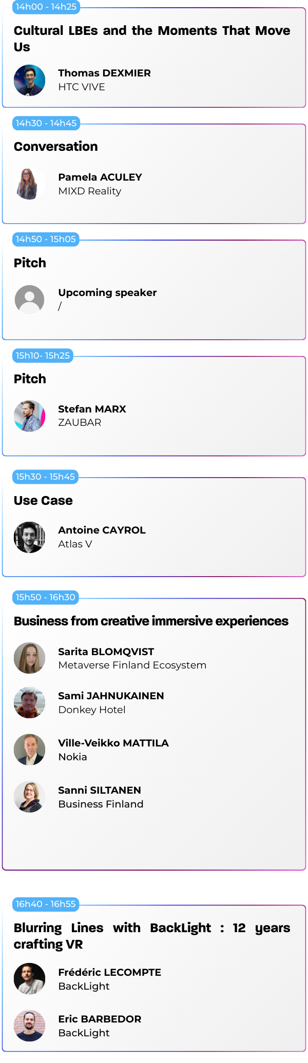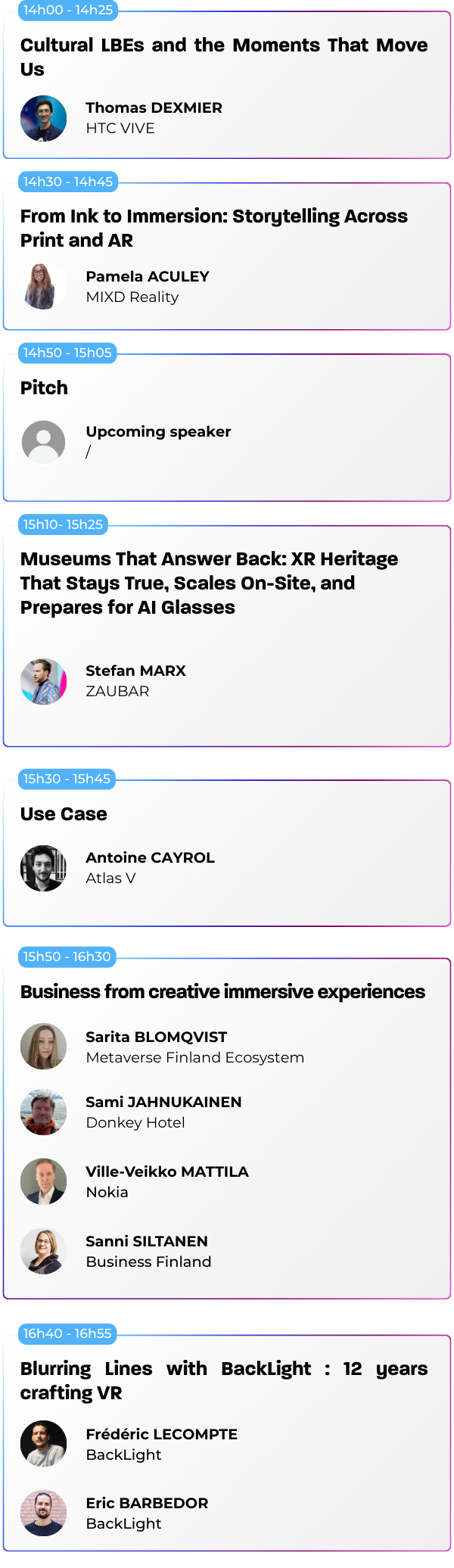 Nos conférences sont ouvertes à tous les visiteurs muni d’un « Full Pass » ou d’un Pass avec l’option « Sessions », qu’il s’agisse de professionnels du secteur, de novices curieux ou d’experts en technologie immersive. Les sessions sont conçues pour offrir des insights à différents niveaux de compétence.