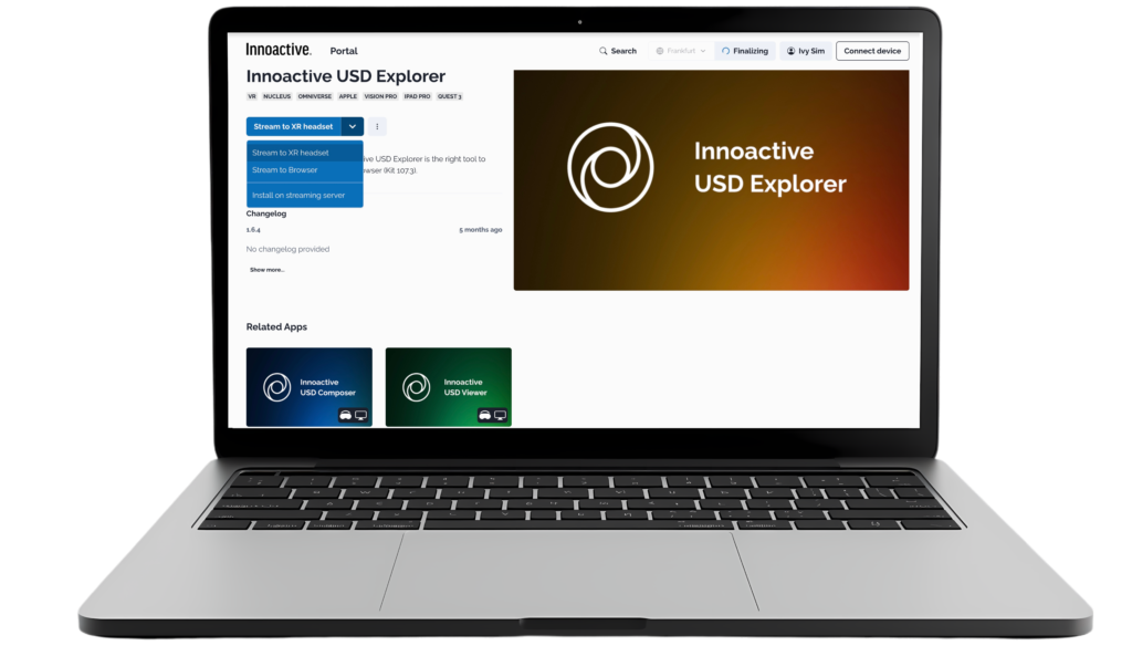 Innoactive is an Enterprise XR Streaming Platform delivering AI-powered spatial streaming for NVIDIA Omniverse on demand worldwide. The platform enables enterprises to launch and stream Omniverse Kit-based applications and photorealistic enterprise digital twins to all XR devices, including Apple Vision Pro, iPad in AR, XR headsets, and browsers. Built for global scalability, multi-user collaboration, and enterprise deployment across cloud and on-premise environments.