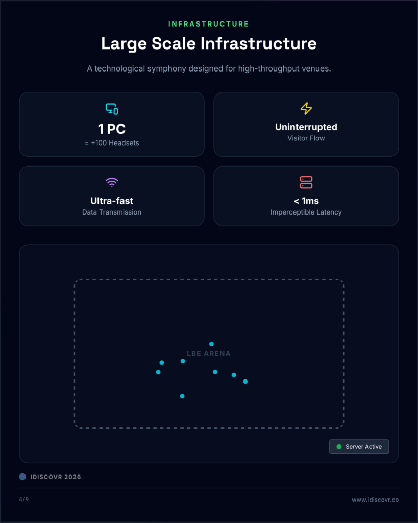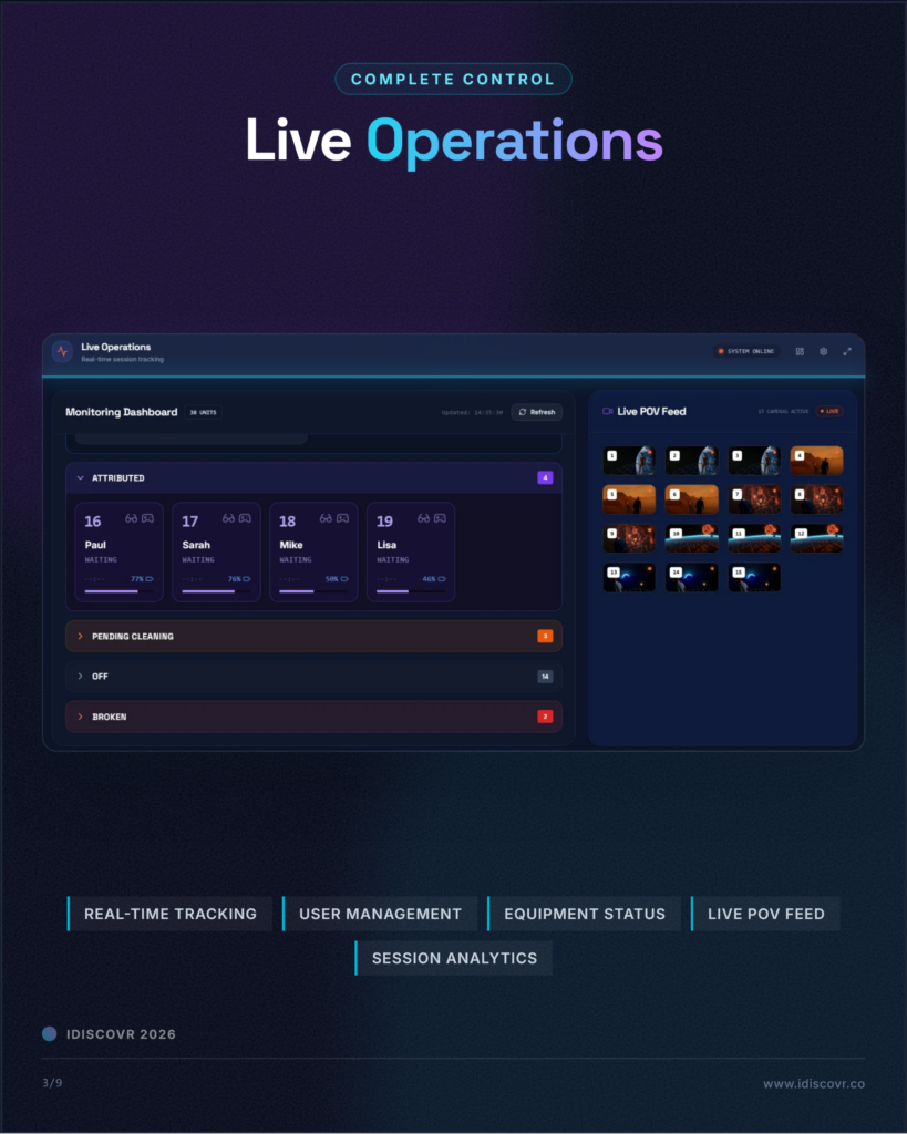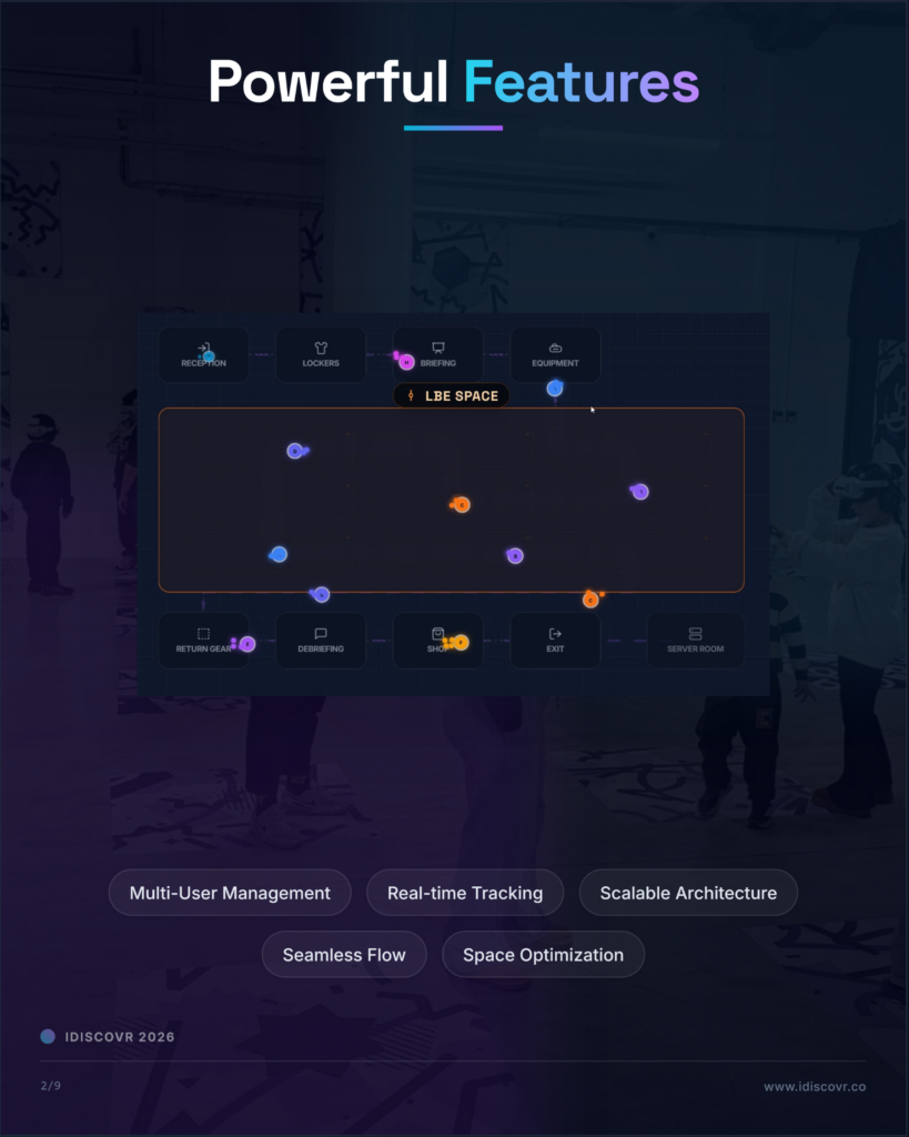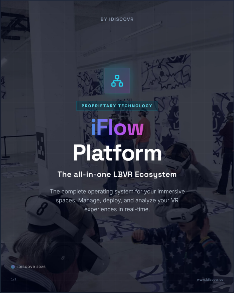 iFlow est la plateforme logicielle propriétaire d’iDISCOVR, conçue pour opérer, superviser et déployer des expériences VR free-roam à grande échelle dans des lieux dédiés.