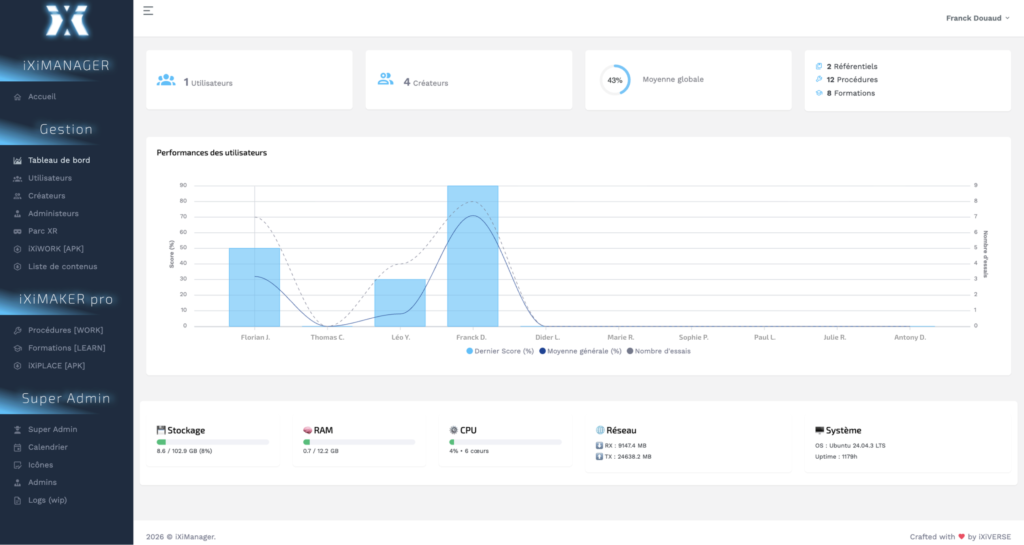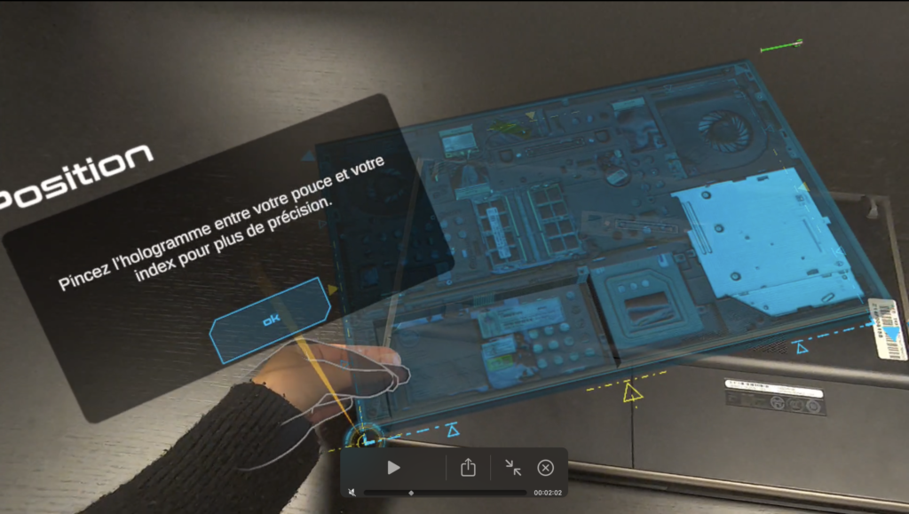 Nous avons développé un écosystème basé sur l’open source permettant aux entreprises et aux organismes de formations d’intégrer simplement la réalité mixte dans leurs usages quotidien. Notre écosystème est composé de trois modules: - iXiMAKER pour la création de contenus XR holographiques, - iXiWORK pour l’utilisation des contenus holographiques sur les masques - iXiMANAGER pour la gestion de parc, le déploiement des contenus et les suivis de progression.